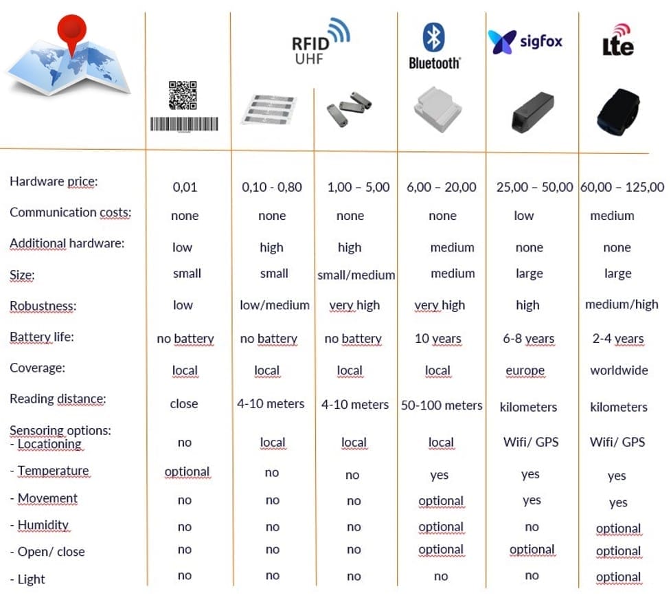 Asset management som tidligere nævnt, kan bruge forskellige løsinger: steg- & QRkoder, rfid, bluetooth, sigfox, lte, gsm etc.